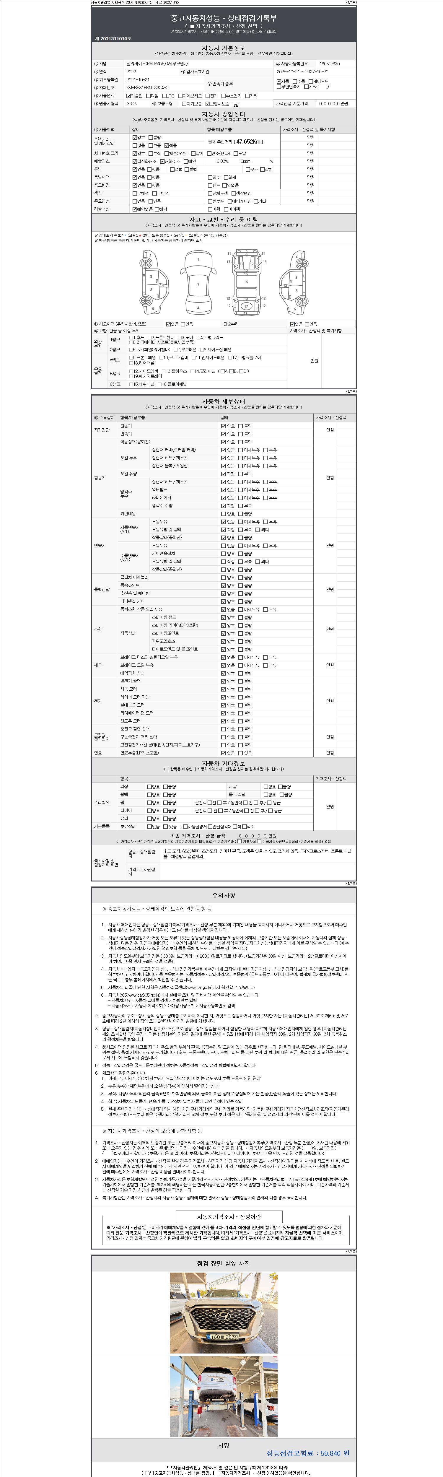 자동차관리법 시행규칙 제120조의 규정에 따라 별지 제 82호서식 《중고자동차 성능, 상태점검 기록부》를 발행한 성능, 상태점검자 및 매매자는 아래의 보증기간 또는 보증거리 이내의 중고자동차, 성능점검 기록부에 기재된 내용과 자동차의 실제 성능, 상태가 다른 경우 계약 또는 관계법령에 따라 매수인에 대하여 책임을 집니다.