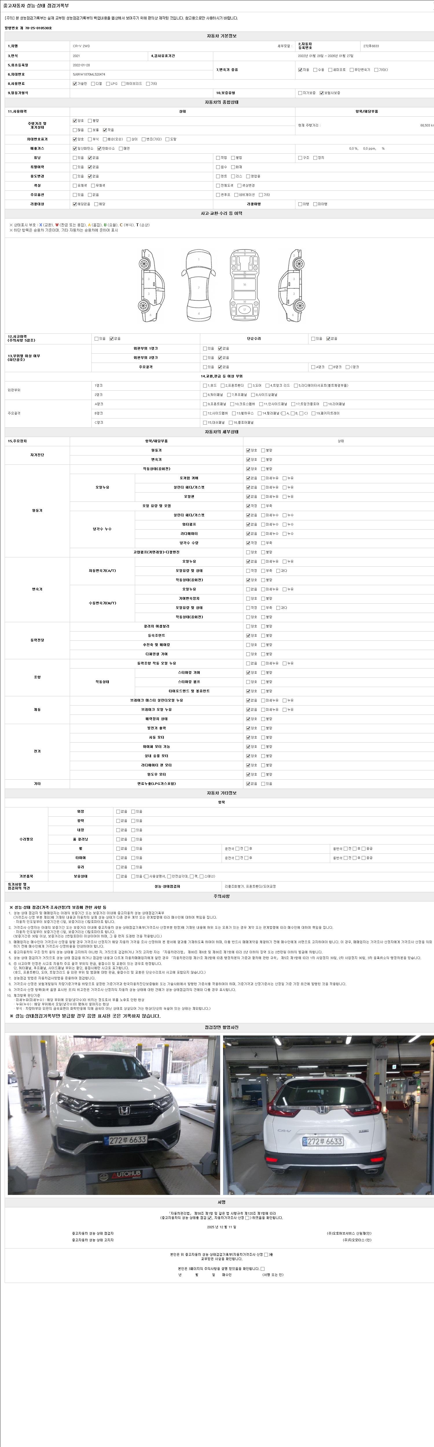 자동차관리법 시행규칙 제120조의 규정에 따라 별지 제 82호서식 《중고자동차 성능, 상태점검 기록부》를 발행한 성능, 상태점검자 및 매매자는 아래의 보증기간 또는 보증거리 이내의 중고자동차, 성능점검 기록부에 기재된 내용과 자동차의 실제 성능, 상태가 다른 경우 계약 또는 관계법령에 따라 매수인에 대하여 책임을 집니다.