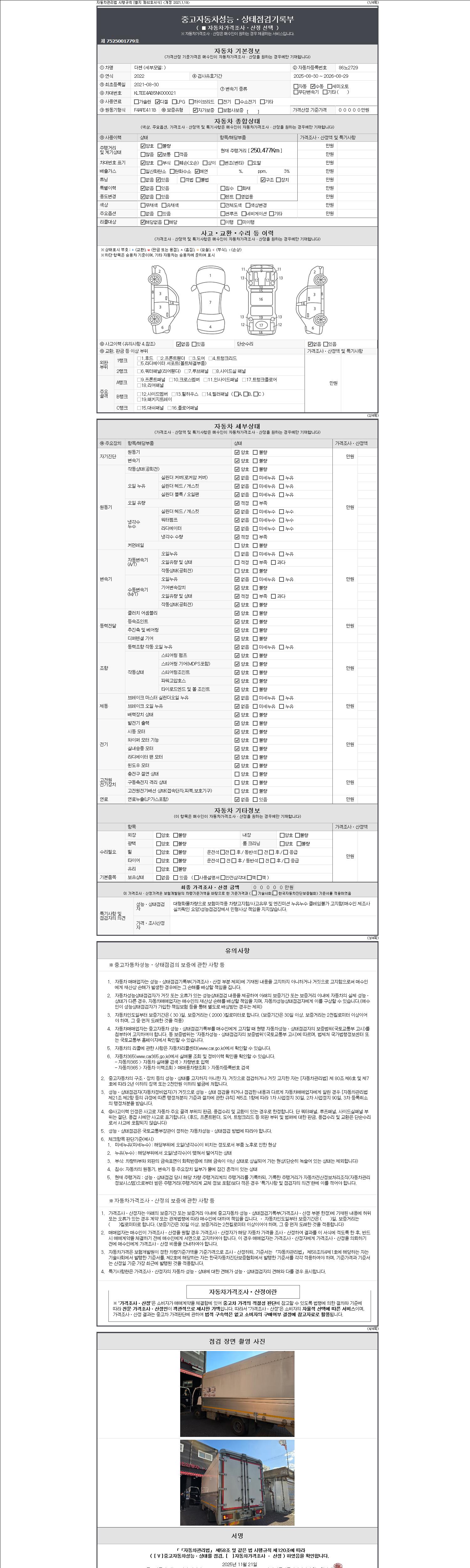 자동차관리법 시행규칙 제120조의 규정에 따라 별지 제 82호서식 《중고자동차 성능, 상태점검 기록부》를 발행한 성능, 상태점검자 및 매매자는 아래의 보증기간 또는 보증거리 이내의 중고자동차, 성능점검 기록부에 기재된 내용과 자동차의 실제 성능, 상태가 다른 경우 계약 또는 관계법령에 따라 매수인에 대하여 책임을 집니다.