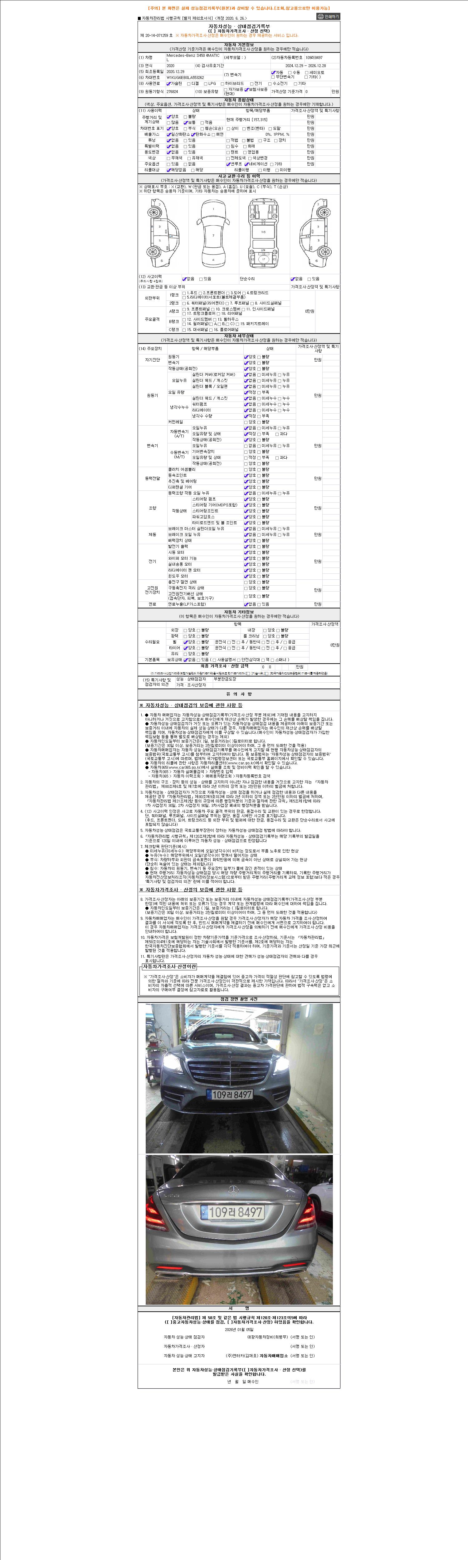 자동차관리법 시행규칙 제120조의 규정에 따라 별지 제 82호서식 《중고자동차 성능, 상태점검 기록부》를 발행한 성능, 상태점검자 및 매매자는 아래의 보증기간 또는 보증거리 이내의 중고자동차, 성능점검 기록부에 기재된 내용과 자동차의 실제 성능, 상태가 다른 경우 계약 또는 관계법령에 따라 매수인에 대하여 책임을 집니다.