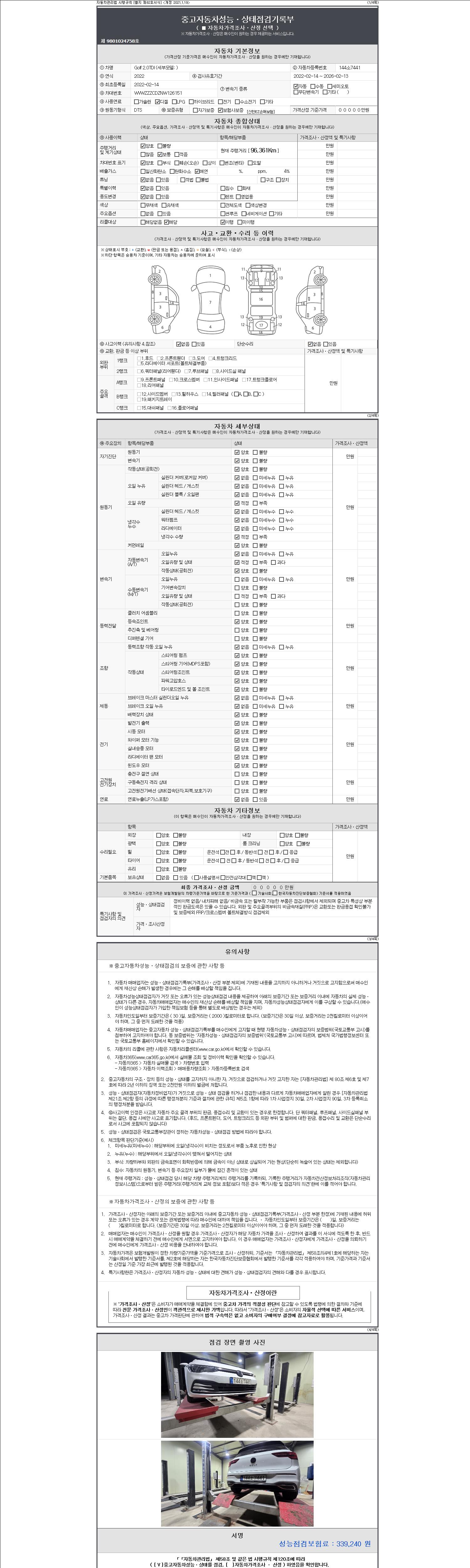 자동차관리법 시행규칙 제120조의 규정에 따라 별지 제 82호서식 《중고자동차 성능, 상태점검 기록부》를 발행한 성능, 상태점검자 및 매매자는 아래의 보증기간 또는 보증거리 이내의 중고자동차, 성능점검 기록부에 기재된 내용과 자동차의 실제 성능, 상태가 다른 경우 계약 또는 관계법령에 따라 매수인에 대하여 책임을 집니다.