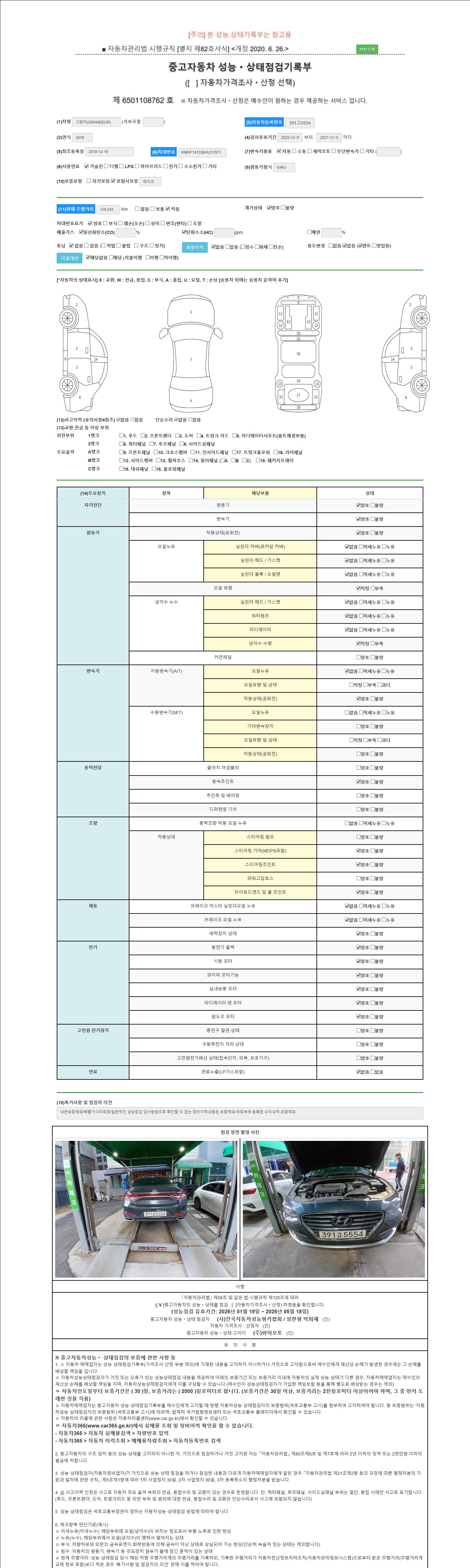 자동차관리법 시행규칙 제120조의 규정에 따라 별지 제 82호서식 《중고자동차 성능, 상태점검 기록부》를 발행한 성능, 상태점검자 및 매매자는 아래의 보증기간 또는 보증거리 이내의 중고자동차, 성능점검 기록부에 기재된 내용과 자동차의 실제 성능, 상태가 다른 경우 계약 또는 관계법령에 따라 매수인에 대하여 책임을 집니다.
